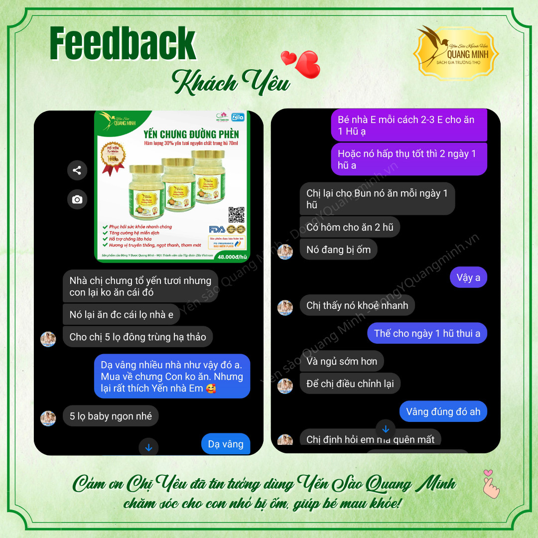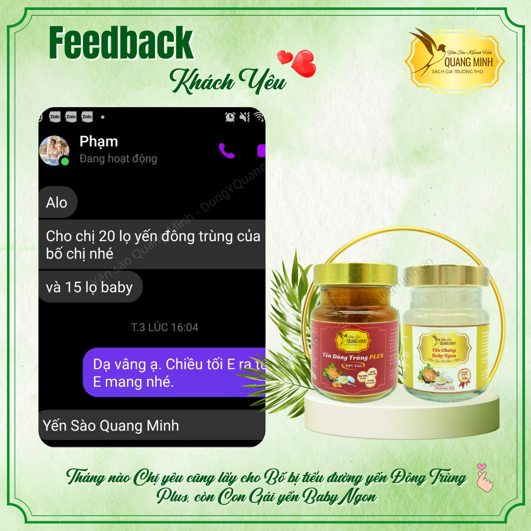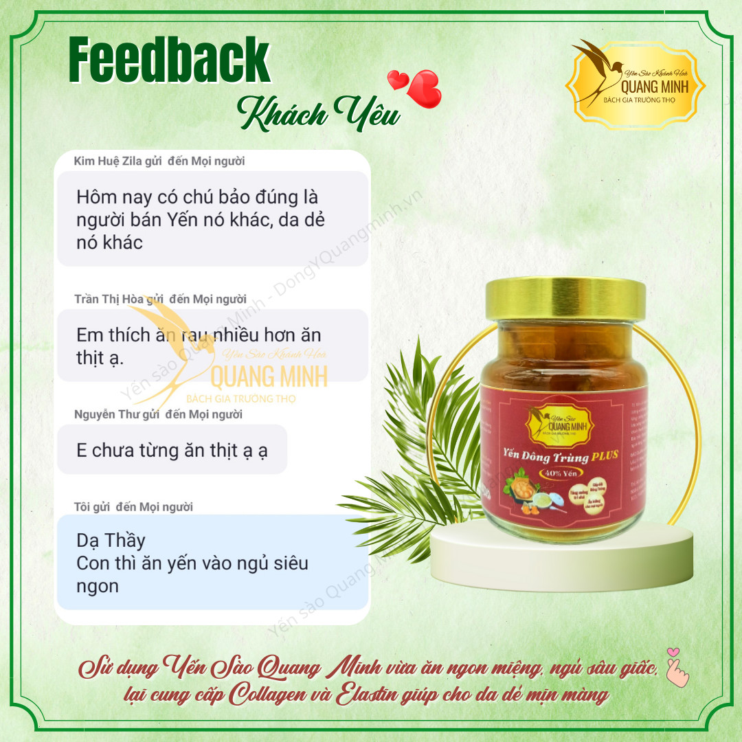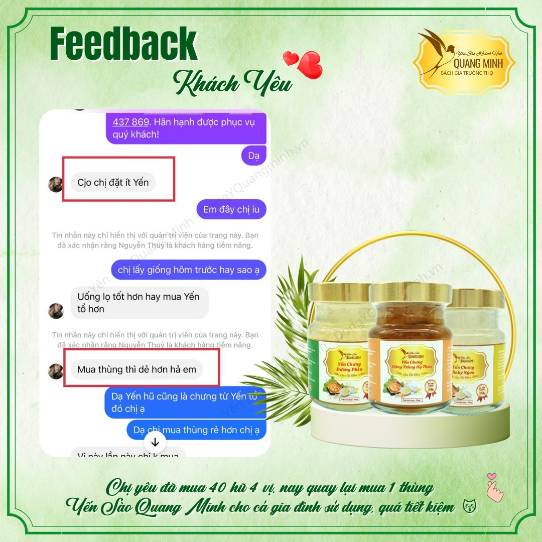 Yến Sào Quang Minh là địa chỉ cung cấp yến sào chưng sẵn chất lượng và giá cả hợp lý, với phương châm sức khỏe khách hàng là sức khỏe của chính mình và người thân. Nếu có bất kỳ thắc mắc gì về các sản phẩm yến sào bạn có thể liên hệ với chúng tôi để được tư vấn kỹ hơn nhé!