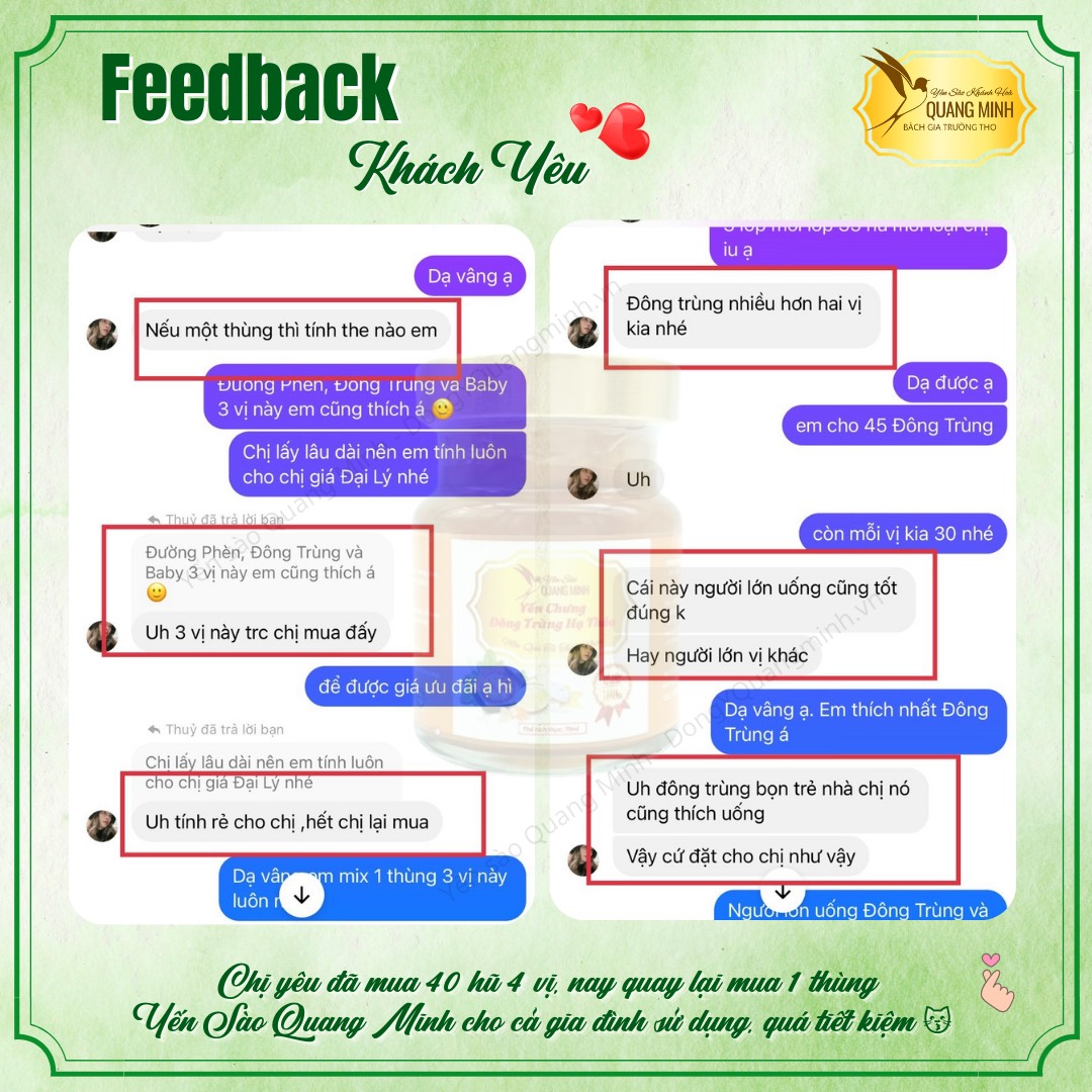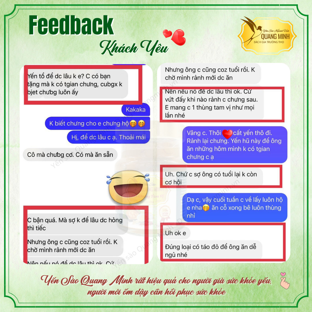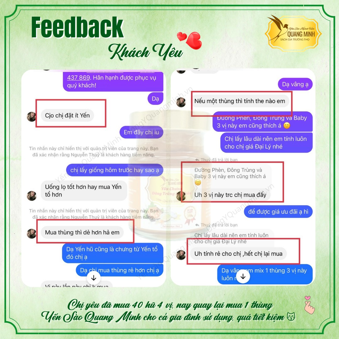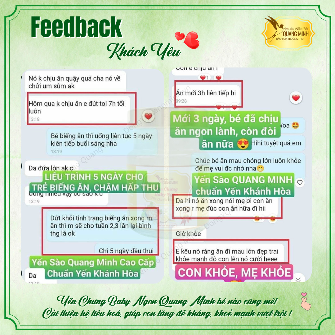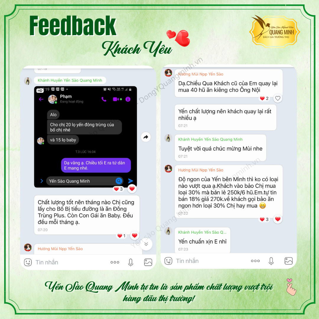Yến Sào Quang Minh là địa chỉ cung cấp yến sào chưng sẵn chất lượng và giá cả hợp lý, với phương châm sức khỏe khách hàng là sức khỏe của chính mình và người thân. Nếu có bất kỳ thắc mắc gì về các sản phẩm yến sào bạn có thể liên hệ với chúng tôi để được tư vấn kỹ hơn nhé!