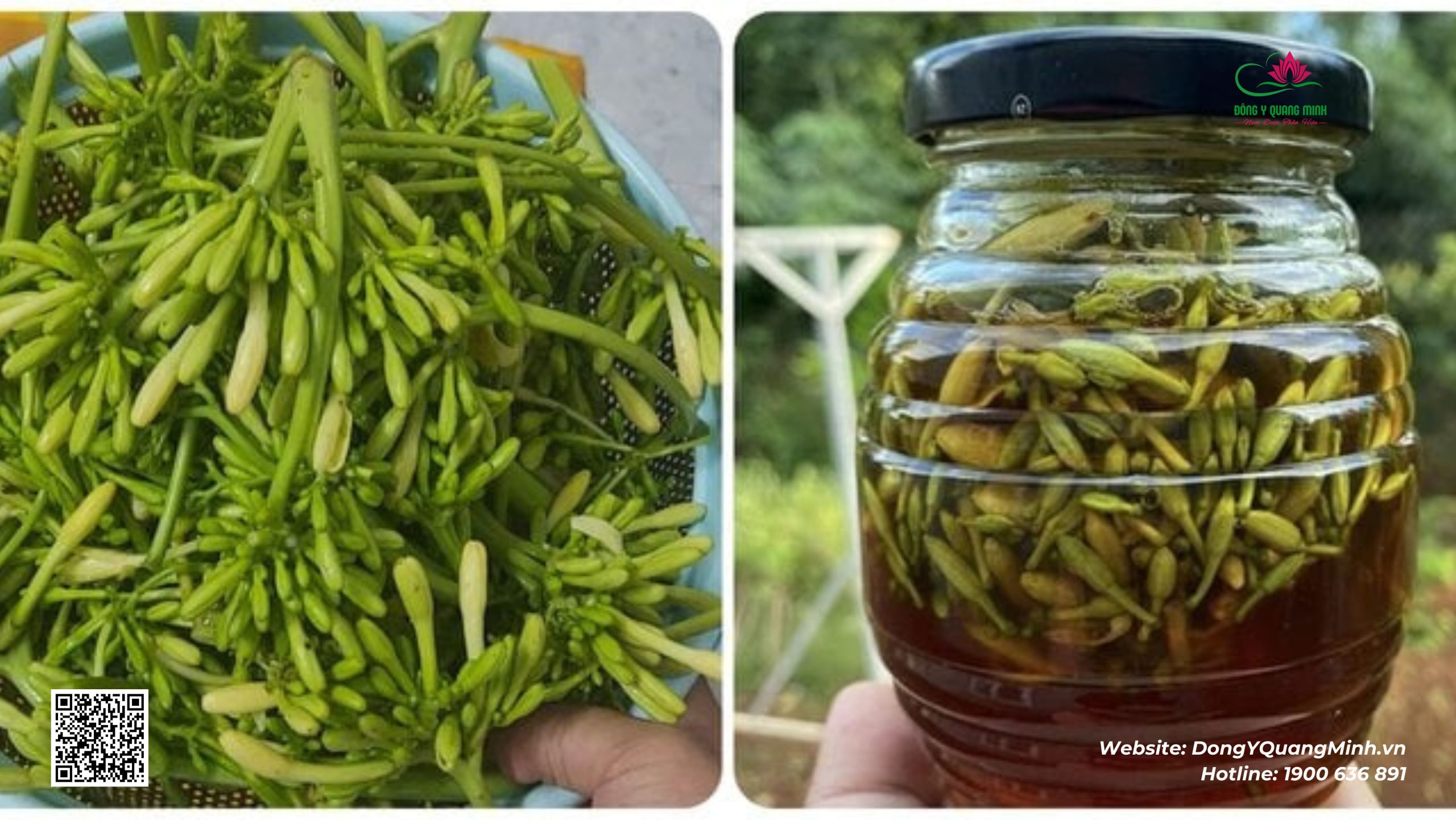 Hoa đu đủ đực 300g tươi ngâm với 1 lít mật ong. Ngâm sau 20 ngày có thể sử dụng được. Thời gian ngâm càng lâu càng tốt.
